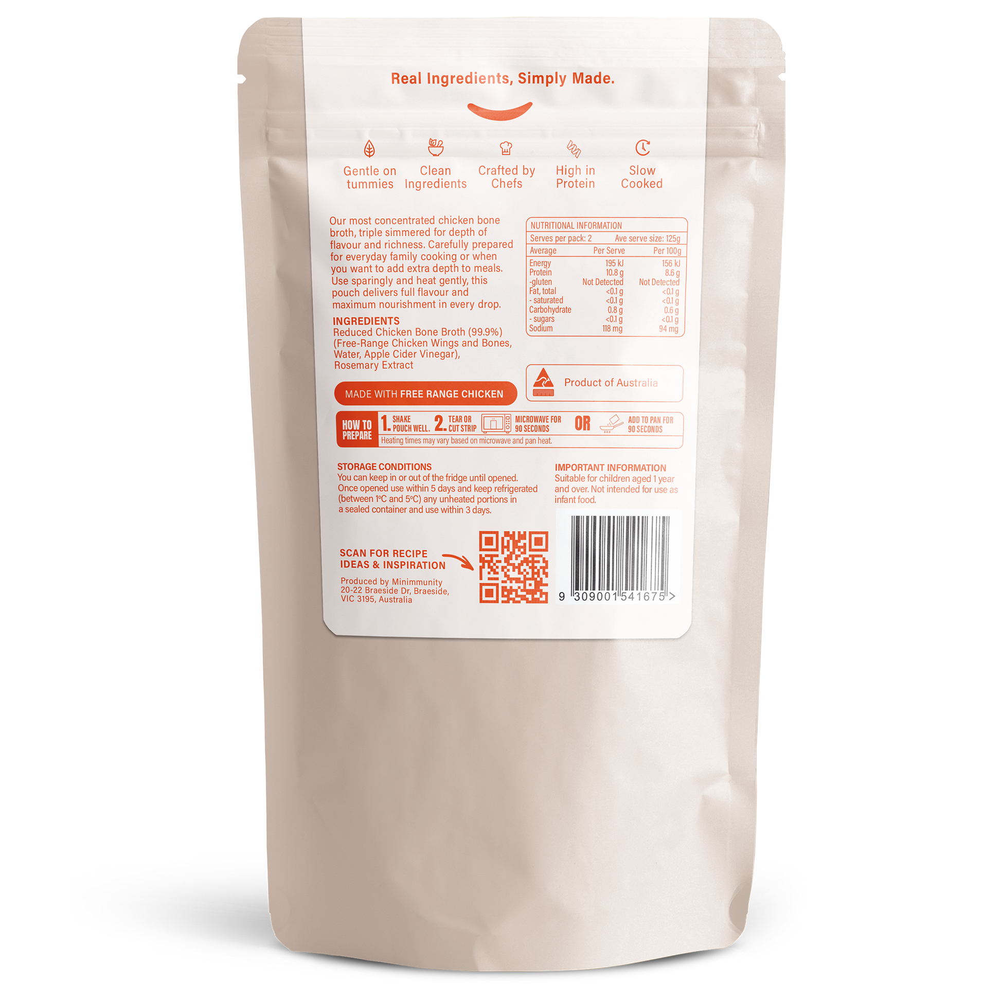 Our most concentrated beef bone broth, naturally reduced to 3x the intensity giving you deep, rich, restaurant-quality taste in your home cooking. Use sparingly and heat gently, this pouch delivers bold flavour and maximum nourishment in every drop.